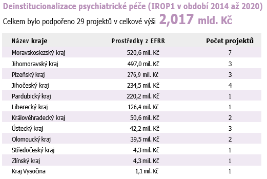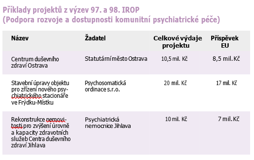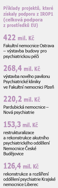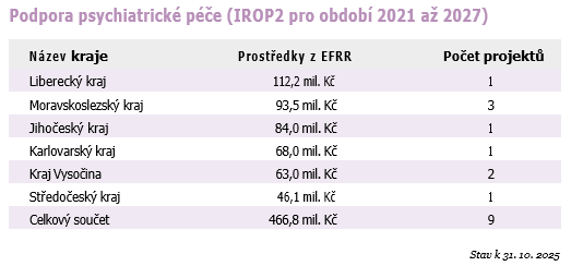K říjnu 2024 byl díky prostředkům z IROP podpořen vznik 180 nových akutních psychiatrických lůžek, z toho 85 dětských. Dětská psychiatrická oddělení vzniknou například v Liberci, Českých Budějovicích, Olomouci a v Kroměříži.